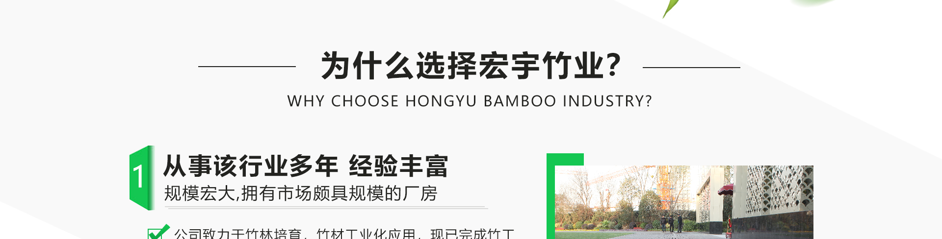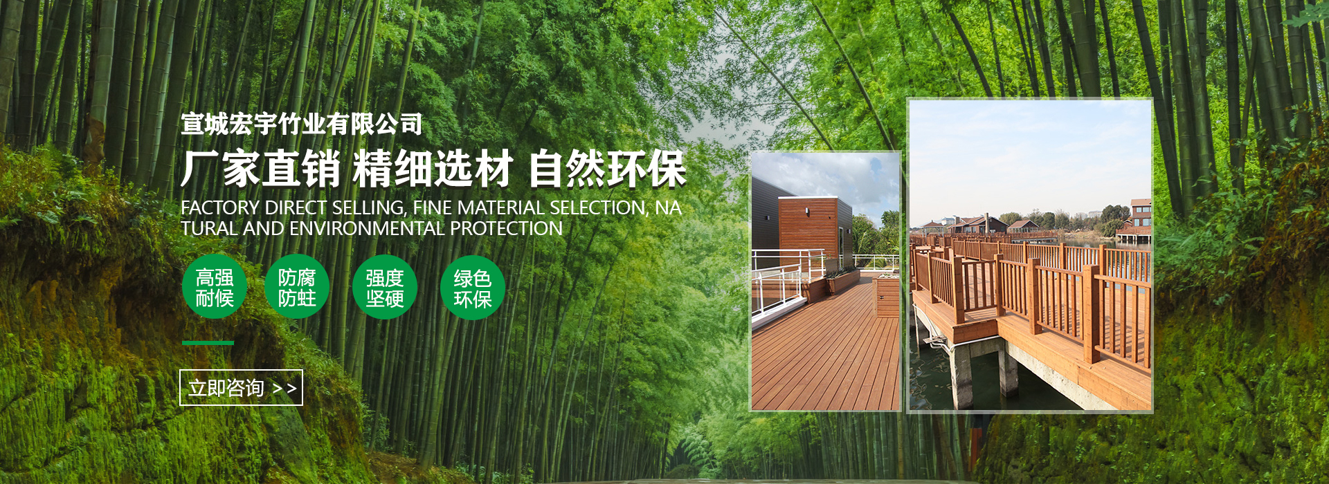 宣城宏宇竹業有限公司位于“華夏毛竹首鎮”的安徽省宣城市涇縣蔡村鎮,公司致力于竹材工業化應用與研發,已完成竹工業化利用第五代技術-竹基纖維復合材技術應用研發,并獲得2015年度國家科技進步獎二等獎。公司擁有行業幅面3850*1320mm的5400噸壓力的20層熱壓機,可以直接壓制3850*1180*52的坯板,具備年產10000立方米的生產能力。宏宇竹業以“領導竹材恒久價值”為己任,以匠心的工藝,銳意進取的管理團隊打造一個產品多樣化、市場多元化的科技型企業。公司從成立之初一直重視品牌建設,公司注冊商標“箐剛“竹,致力打造戶外竹材優異品牌,讓宏宇竹業深入每一個消費者的心。
